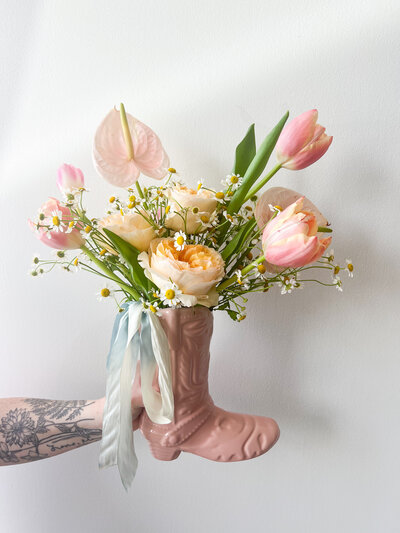 Each piece is designed with seasonal flowers in a coordinating color palette chosen by our expert team.